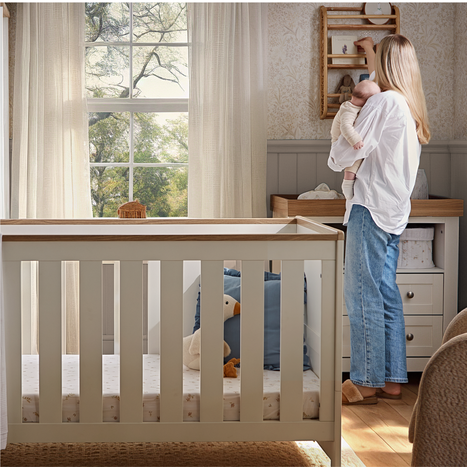CuddleCo’s Burford White & Oak Cot Bed is designed to adapt from birth to toddler stage with adjustable height settings and a conversion mode.