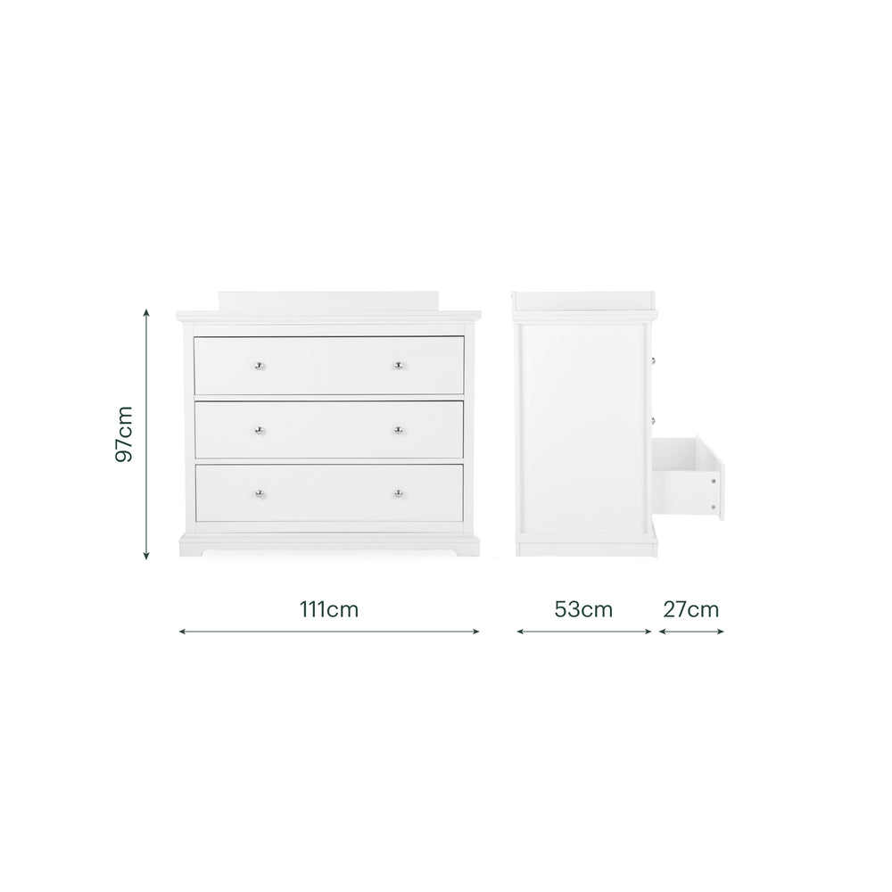 CuddleCo Clara 3pc Set 3 Drawer Dresser, Cot Bed & Wardrobe - White
