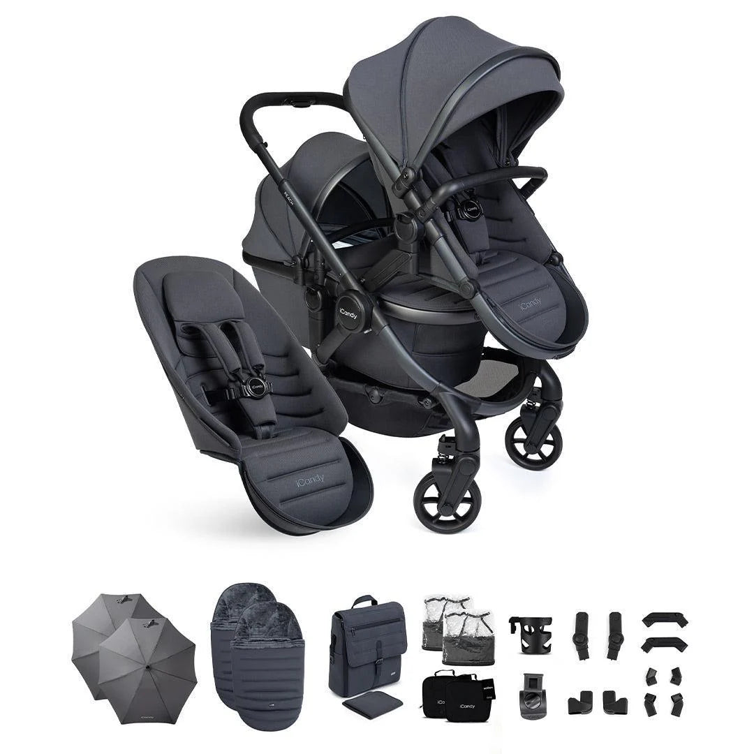 The iCandy Peach 8 Double Complete Bundle in Grey is a beautifully engineered, luxury double pushchair solution, designed to support growing families with both a newborn and toddler. Combining iCandy’s latest pushchair innovation with intelligent, practical functionality, this premium tandem pushchair delivers exceptional comfort, versatility and style for everyday family life.