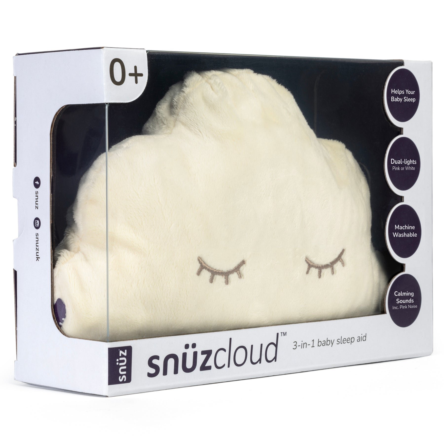 The SnuzCloud in Cashmere, a plush and portable baby sleep aid. With super soft fabric, 4 soothing sounds and two light options; the perfect choice for tired parents to help comfort and settle baby with their lovable cloud companion.