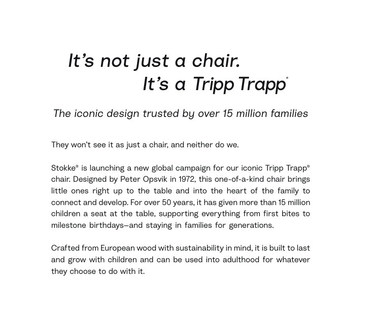 Tripp Trapp® is an ingenious chair designed by Peter Opsvik that revolutionized the children's chair category in 1972, when the Tripp Trapp® was first launched. Tripp Trapp® fits right up to your dining table, bringing your baby into the heart of your family, allowing him or her to learn and develop alongside you. The intelligent, adjustable design allows freedom of movement with both depth and height adjustable seat and footplates. When adjusted correctly, your child is ensured a comfortable and ergonomic seating position at any age.